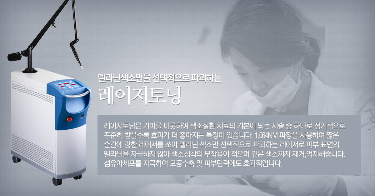 레이저토닝은 낮은 에너지로 여러 번 반복하여 진피의 색소를 짙게 분해, 치료할 뿐만 아니라 콜라겐 재생을 유도하여 진피를 회복시켜줍니다. 또한 열손상을 최소화하여 기미가 금방 짙어지는 부작용을 줄이고 진피재생을 유도하여 전체적인 피부상태가 개선됩니다.