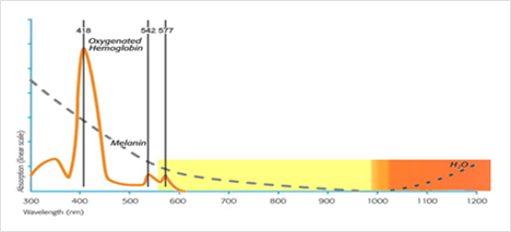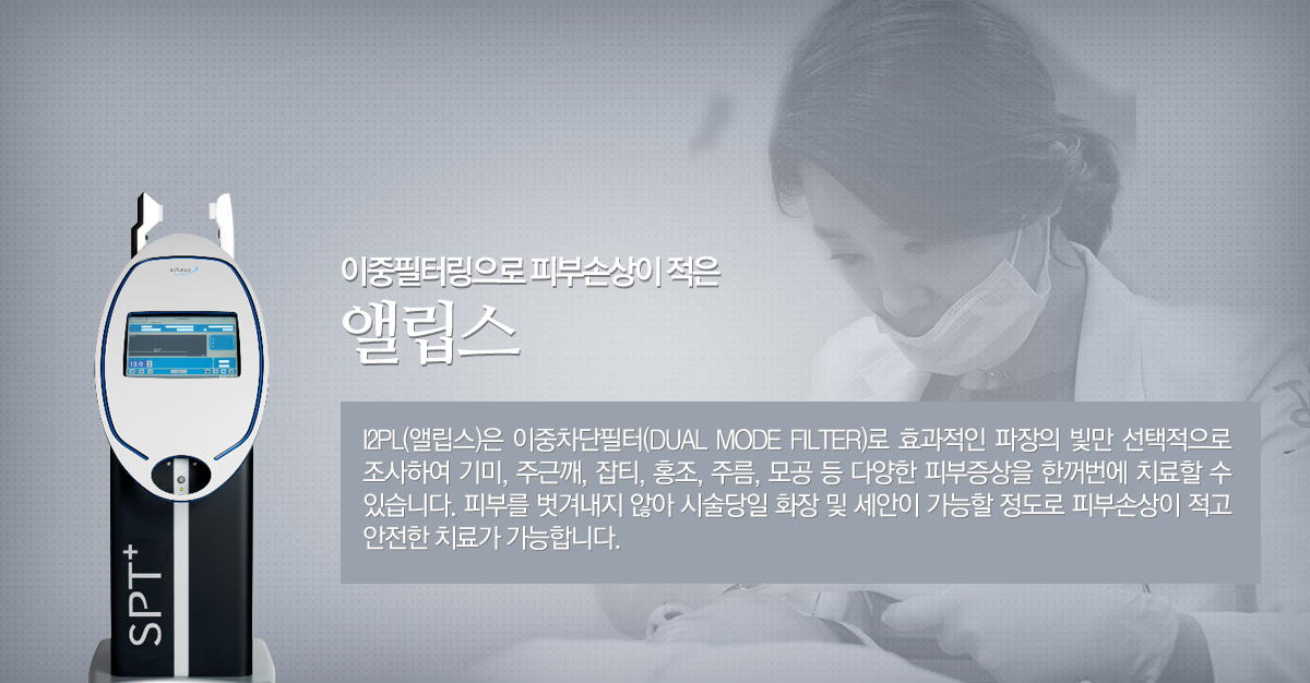 950nm이상의 파장대를 지닌 빛을 피부에 조사할 경우 피부 속 수분의 에너지 흡수가 급격히 증가하여 화상이나 물집과 같은 부작용의 우려가 있습니다. 앨립스레이저는 피부 속 H2O의 열흡수를 막는 이중필터링 기술을 이용하여 950nm이상의 파장대를 cut-off시킴으로써 주변 조직손상의 위험을 줄이고 안전성을 확보하였습니다.