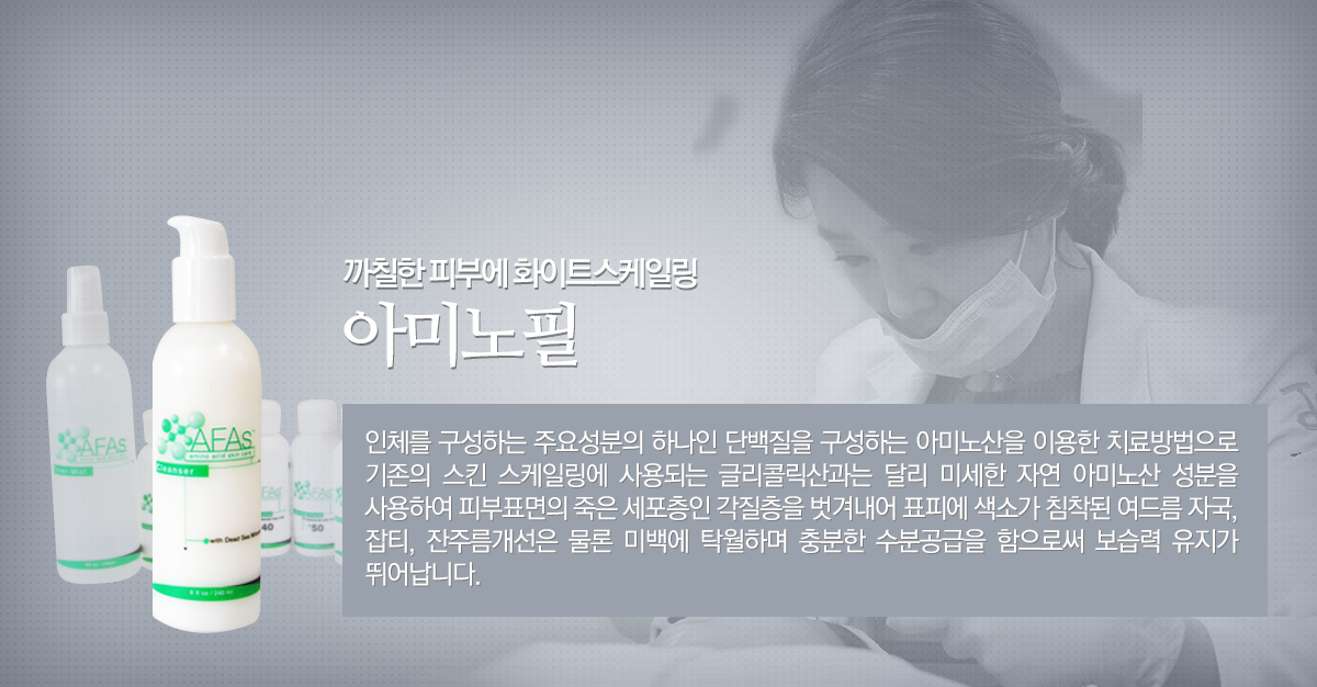 아미노필은 필링과 동시에 자연보습인자와 동일한 아미노산에 기초한 성분을 피부에 공급하여 피부의 수분 보존능력을 높여줍니다. 또한 분자량이 작아 피부에 고르게 침투하여 자극이 없으며 항산화 효과로 인해 광노화로 인한 색소질환에도 효과가 탁월합니다.