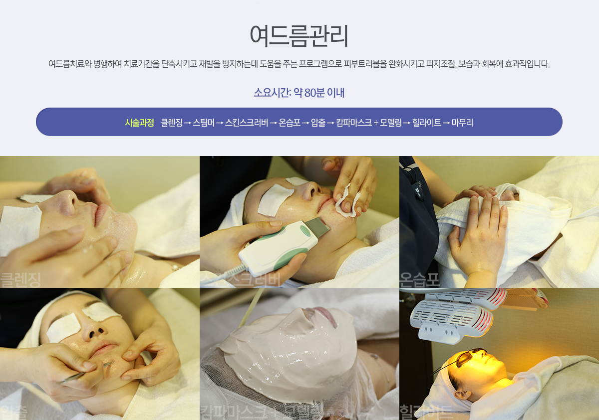 최신장비와 다양한 시술방법을 이용하여 문제성 피부를 치료하고 좋은 피부가 되도록 개선하는 시술입니다. 기존 피부의 관리 외에 여드름이나 기미, 잡티, 잔주름 등 문제성 피부와 알레르기가 있어 민감한 피부는 근본적인 원인을 찾아 단기 혹은 장기적으로 치료해야 앞으로 피부관리를 하는데 도움이 됩니다.