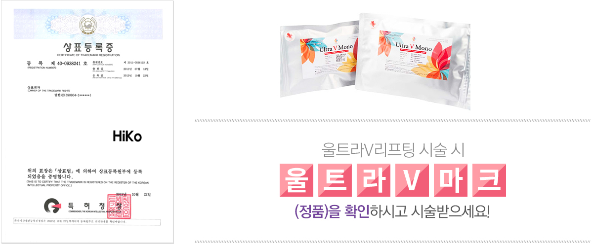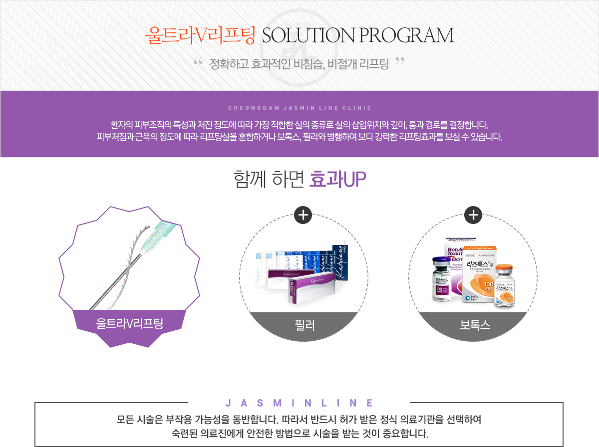 울트라V리프팅은 식약청에서 정식으로 허가받은 안전한 PDO라는 실을 사용하여 정교하고 세밀하게 얼굴 부위에 삽입하는 방식으로 원하는 방향으로 리프팅 효과 및 피부 진피층의 콜라겐을 활성화시켜 처지고 주름진 피부를 탄력있고 팽팽하게 만들어주는 효과가 있습니다.