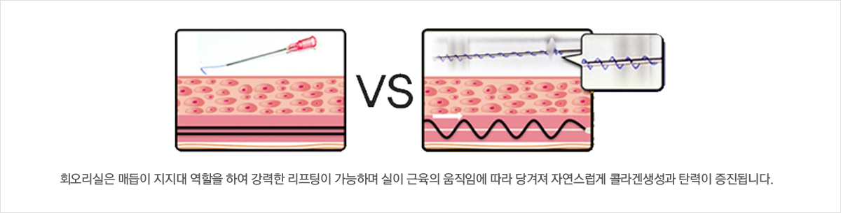 회오리리프팅은 기존의 녹는 실 PDO보다 리프팅 효과와 지속기간이 더욱 강력해진 녹는 실(PDO)로 매듭이 지지대 역할을 하여 삽입된 실을 당겨주고 Screw의 꼬임이 고무줄과 같은 역할을 하여 탄력성이 강하고 피부근육이 원하는 방향으로 자연스럽게 당겨져 강력한 효과를 볼 수 있습니다.