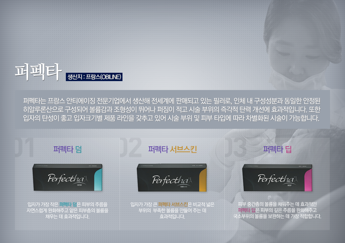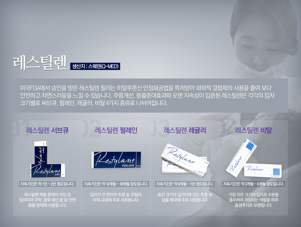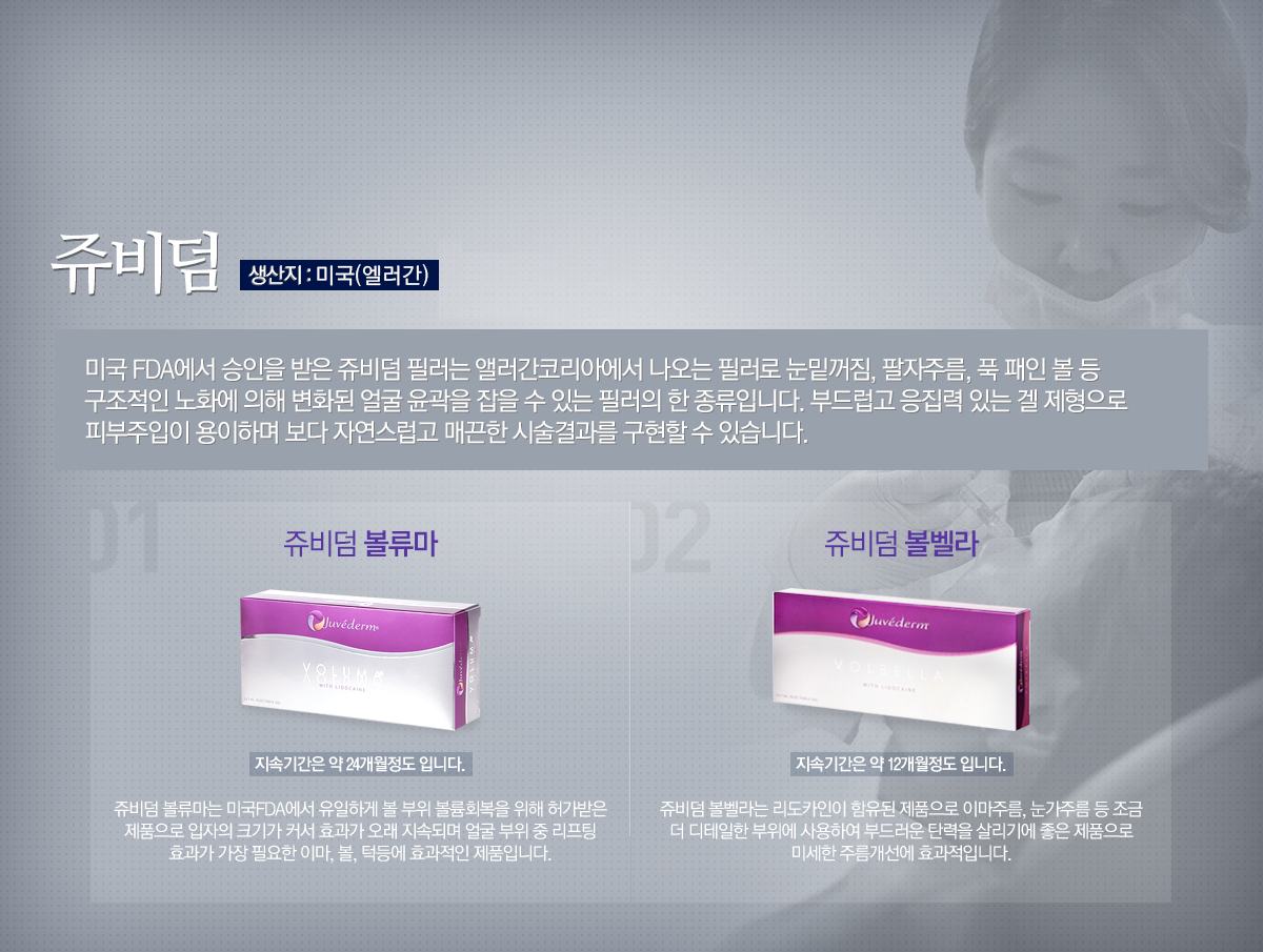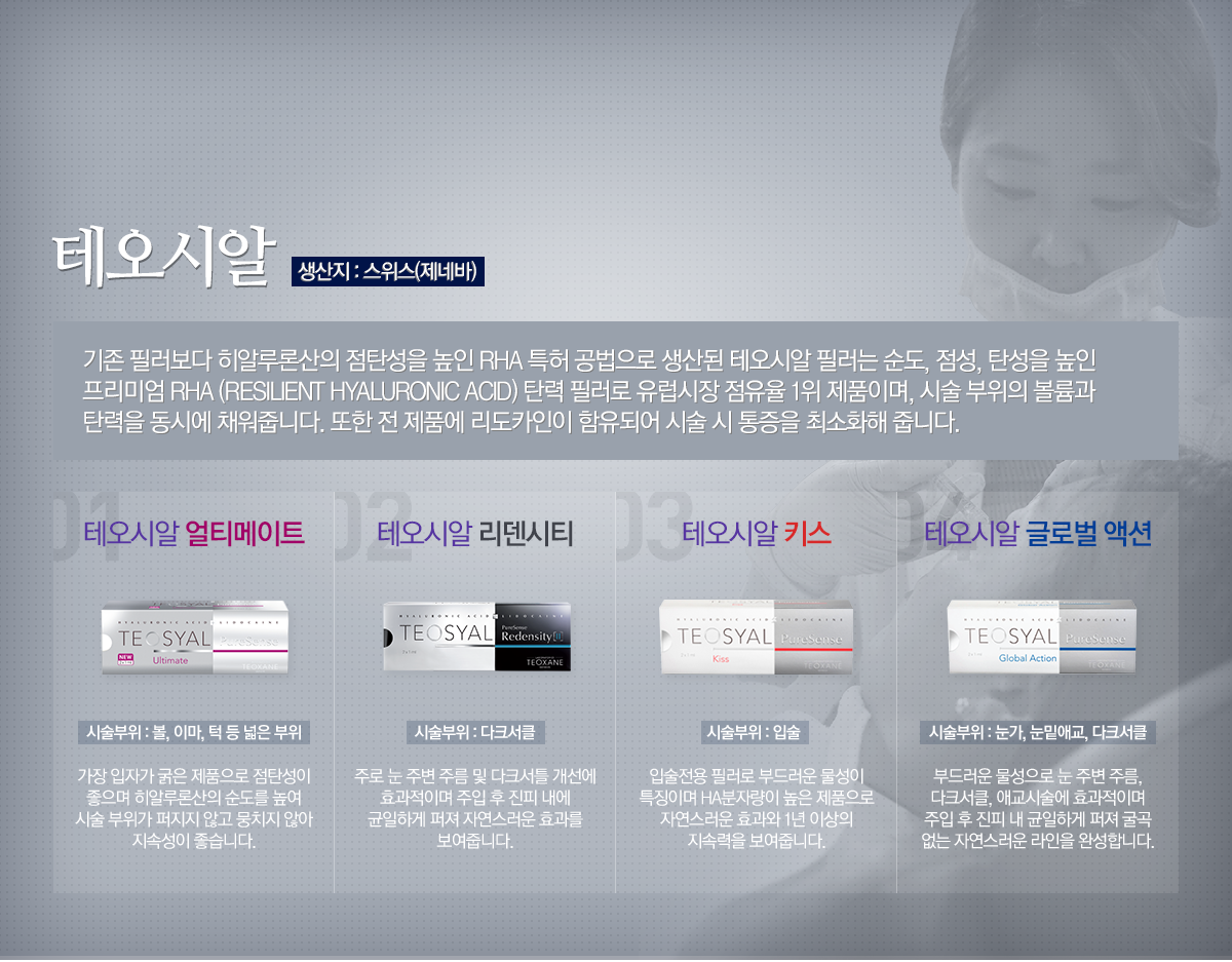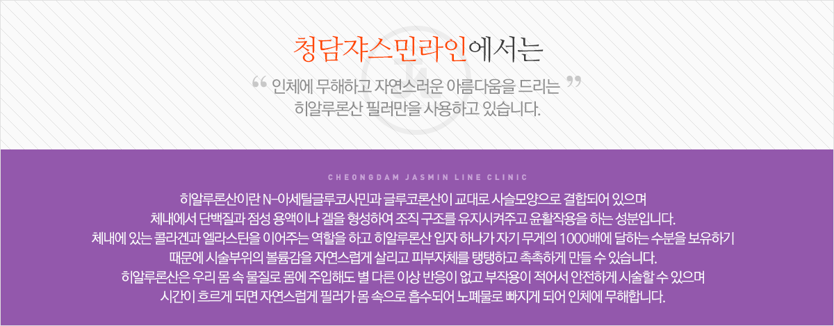 필러는 일반적인 성형수술과는 달리 칼을 사용하지 않고 간단한 주사 시술만으로 단시간에 성형수술과 동일한 효과를 나타내는 시술법입니다. 꺼진 이마나 관자놀이, 팔자주름, 눈가와 입가의 잔주름, 낮은 코 , 꺼진 흉터와 같이 들어가고 함몰된 부분들을 채워 볼륨감과 탄력성을 되찾아줄 수 있습니다.