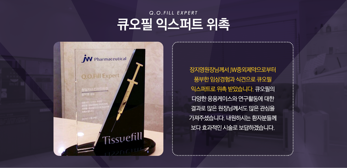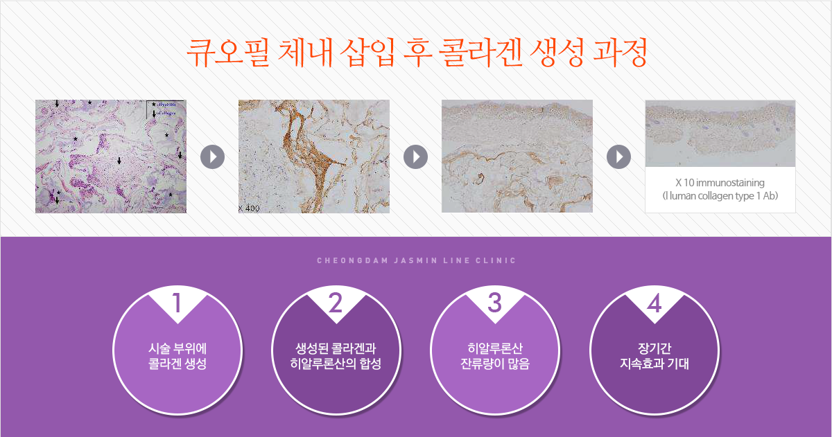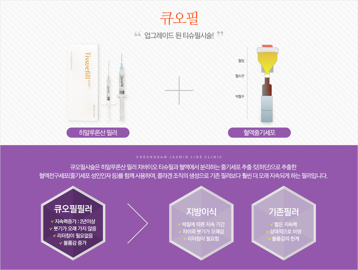 미국 식품의약국 FDA에서 안전성을 입증받은 큐오필은 국내에서 생산된 국산필러제품으로 대형종합병원인 차병원의 연구기관인 (주)차메디텍에서 연구생산된 국산필러제품으로 히알루론산의 짧은 생분해성을 극복하고, 체내 주입시 지속성을 높이기 위해 히알루론산을 구조적으로 안전화시킨 히알루론산 유도체입자로 구성된 신개념 필러입니다.