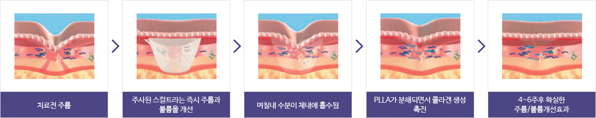 볼륨이 꺼진 얼굴이나 얼굴의 주름이 있는 부위에 볼륨을 넣어 얼굴에 생기를 더해주고 얼굴의 주름을 펴주는 시술입니다. 스컬트라 시술과 동시에 바로 얼굴의 주름개선과 볼륨감을 살려주는 효과가 나타나며 스컬트라의 주성분인 PLLA성분이 체내에서 분해되면서 콜라겐 재생을 촉진시킵니다. 콜라겐 재생을 통해 지속적으로 얼굴의 볼륨감과 얼굴의 주름개선효과가 유지됩니다.