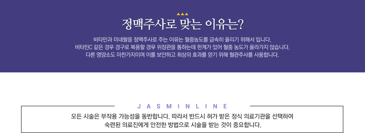 환자의 상태에 따라 미네랄과 수용성 비타민을 적절히 배합해서 빠른 시간 내에 효과를 볼 수 있는 정맥주사 요법입니다.