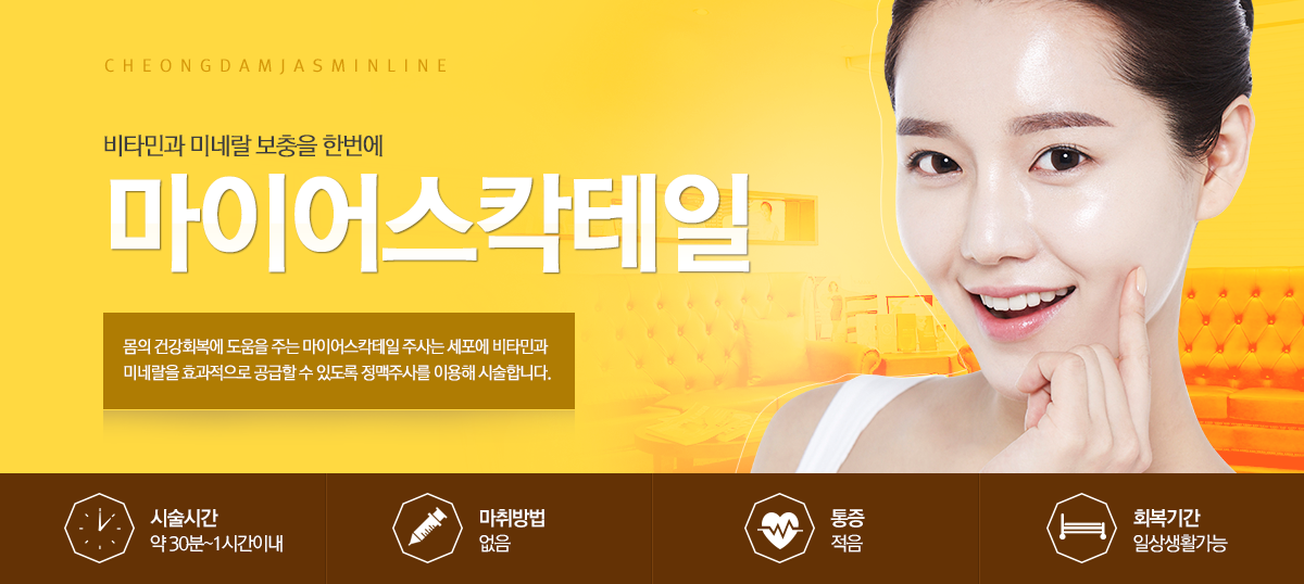 미국 내과의사 존 마이어스에 의해 시작된 것으로 다양한 질환에 비타민과 미네랄을 혼합하여 고용량의 비타민을 정맥으로 빠르고 효과적으로 흡수하기 위한 주사요법입니다. 태반, 마늘, 감초주사 등 한가지만 맞아도 효과적이지만 함께 믹스한 칵테일 요법으로 맞을 시 효과와 지속성이 더욱 뛰어납니다.