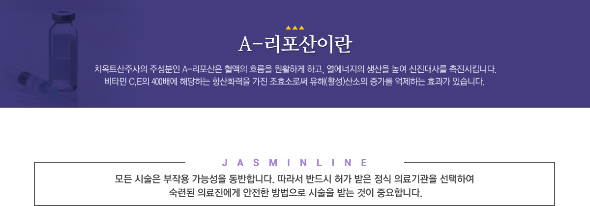 나이가 들어가면서 모든 세포는 노화가 되어가는데 이는 a-리포산의 체내 생산량이 감소해가는 이유이며 이로 인해 활성산소와 환경독소에 취약하게 됩니다. 치옥트산주사는 우리 몸의 활성산소를 없애주는 항산화요법의 대표 주사요법으로 a-리포산 성분의 자사제입니다. 주성분인 리포산이 혈액의 흐름을 원활하게 하고 열에너지의 생산을 높여 신진대사를 촉진시킴으로써 체지방은 물론 피로회복, 노화방지에 효과적입니다.
