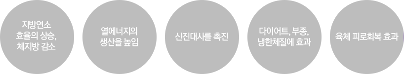 혈액의 흐름을 원활하게 하고 열에너지의 생산을 높여 신진대사를 촉진시킵니다. 따라서 체지방 감소효과는 물론 비만 예방, 다이어트, 부종, 냉한 체질에도 효과적입니다.