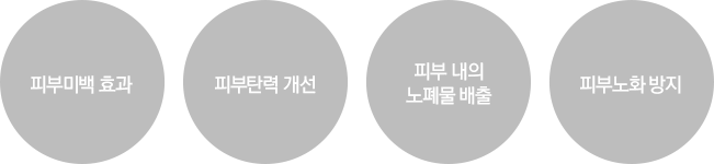 체내 여러 세포를 활성화시키는 동시에 누적된 유해요소를 배출시킵니다. 미백효과는 물론 피부탄력 개선, 혈액순환 개선에도 효과가 있어 피부를 젊게 유지시키는데 효과적입니다.